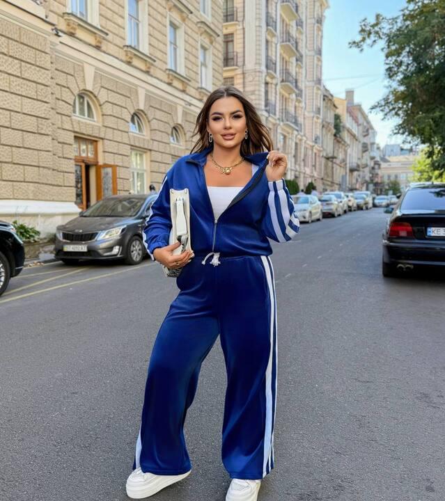 Верхняя часть комплекта смотрится стильно и спортивно, придавая образу более собранный характер. Декоративные контрастные полосы на рукавах добавляют динамику и делают костюм заметнее. Благодаря таким деталям модель выглядит более выразительно и современно, а сам образ приобретает модное спортивное настроение. Комплект отлично подходит для тех, кто любит комфортную одежду с эффектной подачей и хочет выделяться без лишних усилий.