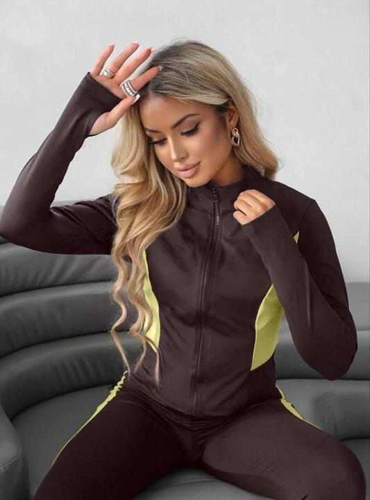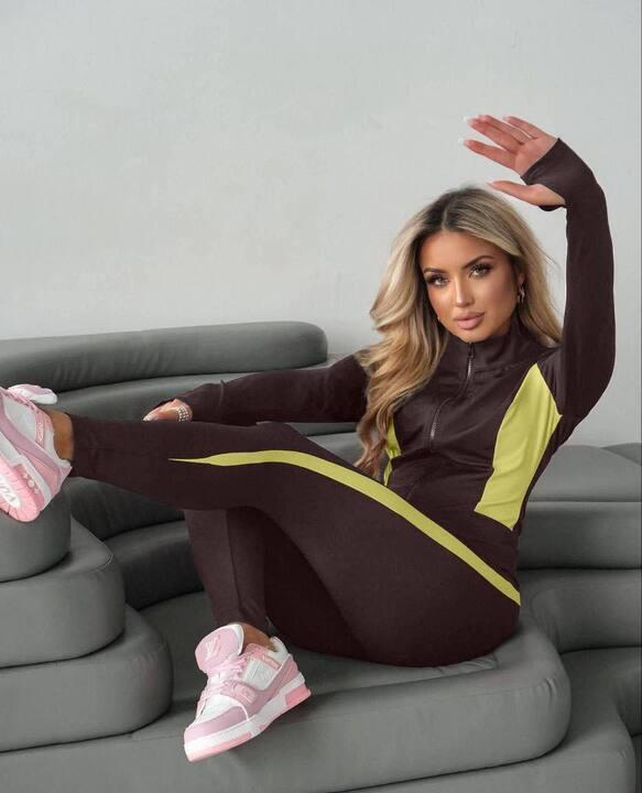 Комплект состоит из кофты на молнии и облегающих леггинсов. Верх выполнен в удобном прилегающем крое, за счет чего образ выглядит стройно, современно и женственно. Кофта аккуратно садится по фигуре, подчеркивает силуэт и не выглядит громоздко. Молния делает модель особенно практичной, позволяя носить костюм в разном варианте и легко адаптировать его под настроение и стиль. Длинные рукава добавляют комфорта и делают модель более универсальной для демисезонного гардероба.