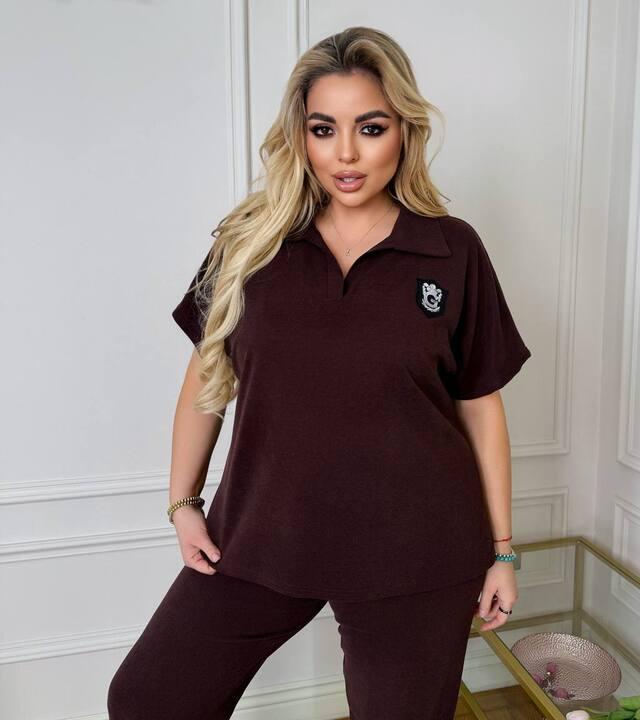 Комплект состоит из футболки-поло и брюк-джоггеров, что делает его особенно практичным и удобным для повседневной носки. Верх выполнен в свободном крое, за счет чего модель выглядит современно и расслабленно, красиво садится по фигуре и не сковывает движения. Воротник в стиле поло добавляет образу более аккуратный и собранный вид, а короткий рукав делает костюм удобным для ежедневного использования. Небольшой декоративный акцент на груди добавляет модели характер и делает комплект визуально интереснее.