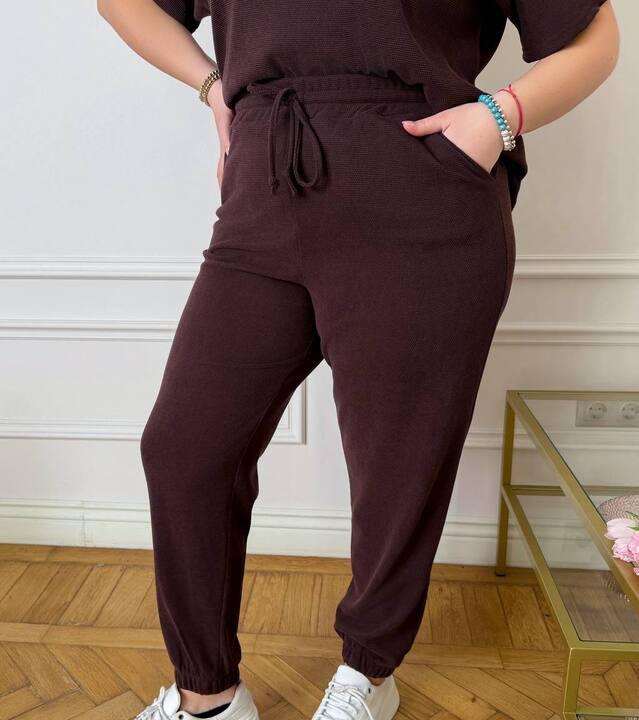 Брюки выполнены с высокой посадкой на эластичной резинке, поэтому они удобно садятся, хорошо держатся и подчеркивают силуэт без лишнего дискомфорта. Карманы в боковых швах делают модель более практичной и удобной в течение дня. Низ брюк оформлен на резинке, благодаря чему костюм смотрится завершенно, а посадка остается аккуратной и современной. Такой фасон особенно удобен для активного ритма, потому что позволяет легко двигаться и чувствовать себя уверенно в любой ситуации.