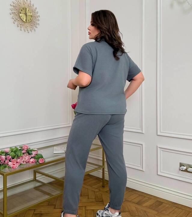 Комплект состоит из футболки-поло и брюк-джоггеров, что делает его особенно практичным и удобным для повседневной носки. Верх выполнен в свободном крое, за счет чего модель выглядит современно и расслабленно, красиво садится по фигуре и не сковывает движения. Воротник в стиле поло добавляет образу более аккуратный и собранный вид, а короткий рукав делает костюм удобным для ежедневного использования. Небольшой декоративный акцент на груди добавляет модели характер и делает комплект визуально интереснее.