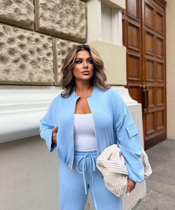 Такой костюм прекрасно сочетается с кроссовками, кедами, жилетами, куртками и объемными сумками. Его можно носить комплектом или комбинировать каждую вещь отдельно с другими элементами гардероба. Это практичный и стильный выбор для женщин, которые ценят свободу движений, удобную посадку и актуальный повседневный стиль.