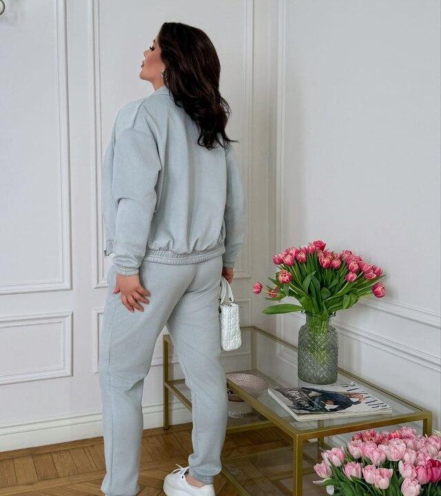 Комплект состоит из кофты на молнии и брюк. Кофта выглядит лаконично и аккуратно, удобно застегивается, хорошо сидит по фигуре и при этом не сковывает движения. Ее можно носить как полностью застегнутой, так и слегка расстегнутой, сочетая с топом, майкой или футболкой. Такой вариант особенно удобен в течение дня, когда важны практичность и возможность легко адаптировать образ под разную погоду и настроение. Брюки дополнены карманами, что делает модель еще более удобной в повседневной носке, а эластичный пояс на резинке обеспечивает комфортную посадку и помогает костюму хорошо садиться по фигуре.