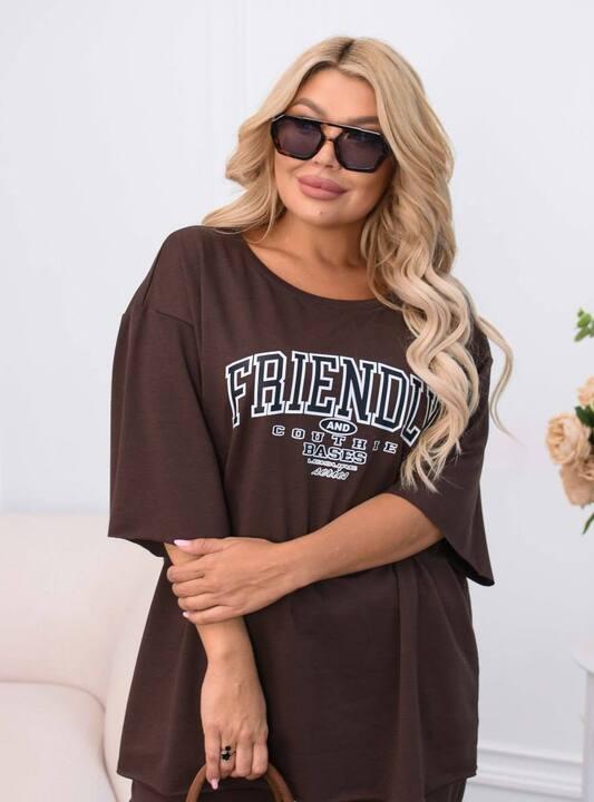 Футболка свободного оверсайз-кроя делает образ особенно актуальным и комфортным. Она мягко ложится по фигуре, не сковывает движения и создаёт тот самый расслабленный силуэт, который так ценится в современной повседневной одежде. Крупная надпись на передней части добавляет комплекту характер, делает его более выразительным и придаёт образу динамику. Удлинённый верх хорошо смотрится в носке, создаёт ощущение лёгкости и позволяет чувствовать себя уверенно в течение всего дня. Такая футболка легко сочетается не только с брюками из комплекта, но и с джинсами, шортами или леггинсами.