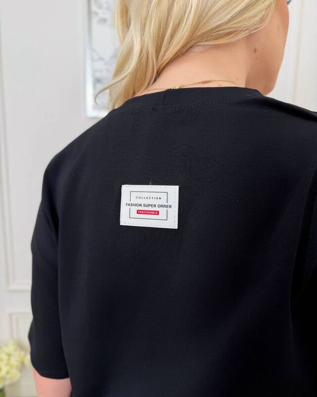 Верх выполнен в виде футболки свободного кроя с коротким рукавом и аккуратным круглым вырезом. Фасон не обтягивает фигуру, комфортно садится в области груди, талии и бедер, помогает скрыть лишний объем и дарит свободу движений. Декоративная вставка снизу создает модный эффект многослойности, визуально освежает образ и делает футболку более интересной без лишней перегруженности. Небольшая нашивка добавляет аккуратный современный акцент.