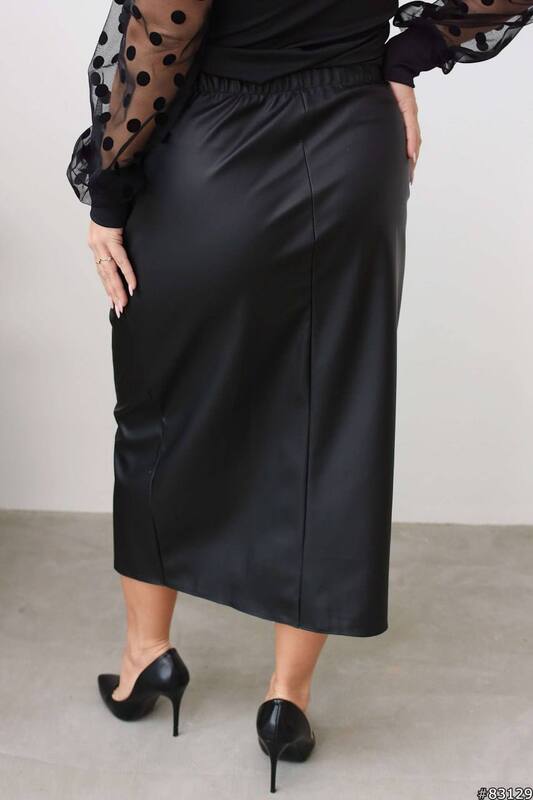 Юбка имеет приталенный крой и длину миди, что визуально вытягивает силуэт и делает образ более женственным и изысканным. Особенность модели — имитация запаха с изящным разрезом спереди, который добавляет нотку сексуальности, не нарушая элегантность. Лёгкие драпировки в области талии мягко подчеркивают фигуру, скрывая возможные нюансы.