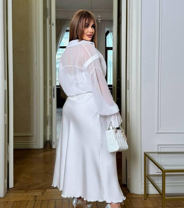Модель выполнена из королевского атласа — материала, который особенно красиво смотрится в движении и при освещении. Ткань мягко струится, деликатно переливается и создаёт тот самый благородный эффект, благодаря которому даже лаконичная вещь выглядит нарядно и стильно. Атлас приятно ложится по фигуре, не утяжеляет образ и делает его более изящным. Именно такая фактура позволяет юбке выглядеть актуально, дорого и очень женственно, оставаясь при этом удобной для сочетания с разным верхом и обувью.