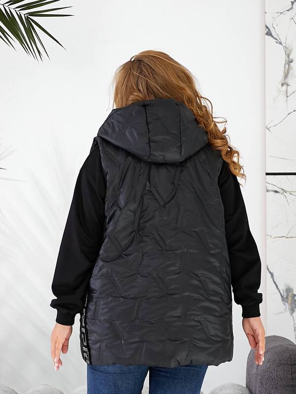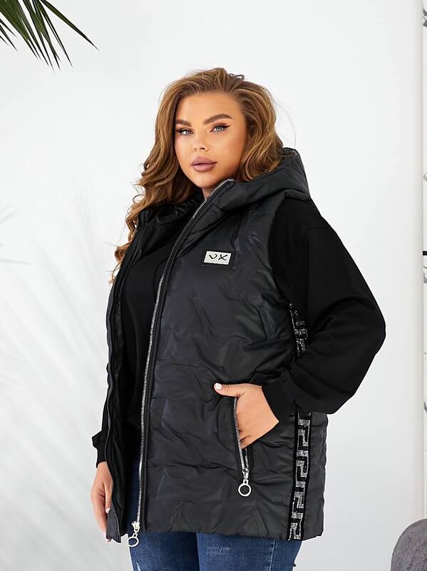 Жилетка має прямий крій, який пасує будь-якому типу фігури, не сковує рухів і дозволяє комфортно носити її поверх светра чи худі. Центральна блискавка з якісною фурнітурою додає практичності, а функціональні кишені на змійках зручні для рук або дрібниць. Глибокий капюшон створює додатковий захист від холоду, а лампаси з камінням додають ефектного та сучасного вигляду.