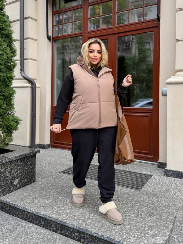 Жилетка имеет современный прямой крой и универсальную длину, что позволяет сочетать её с худи, свитшотами или трикотажными костюмами. Молния по всей длине делает модель удобной в повседневной носке, а боковые карманы добавляют практичности. Высокий воротник создаёт дополнительную защиту от холода и подчёркивает аккуратность дизайна.