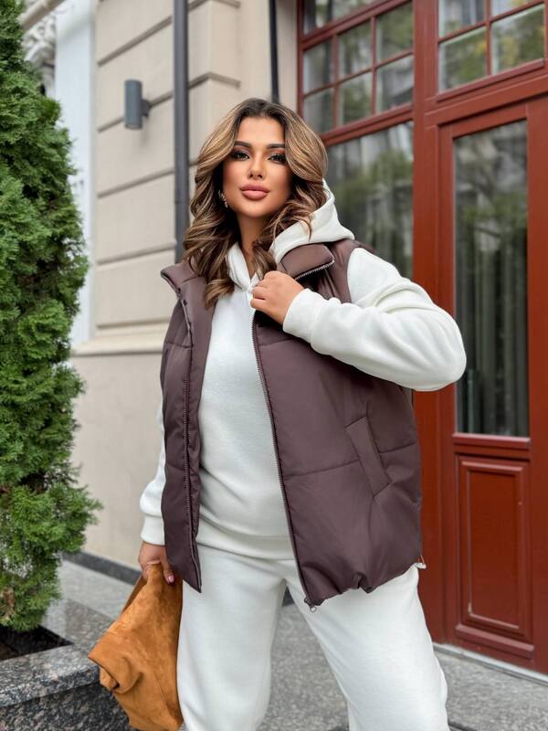 Жилетка имеет современный прямой крой и универсальную длину, которая позволяет сочетать её как со спортивными костюмами, так и с повседневной одеждой. Молния по всей длине делает модель практичной и удобной в использовании, а боковые карманы придают дополнительный комфорт и функциональность. Высокий воротник и аккуратные прострочки подчеркивают аккуратный силуэт и добавляют стилю актуальности.