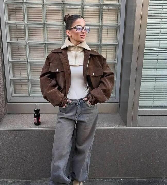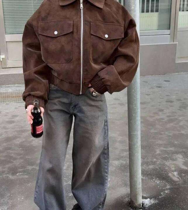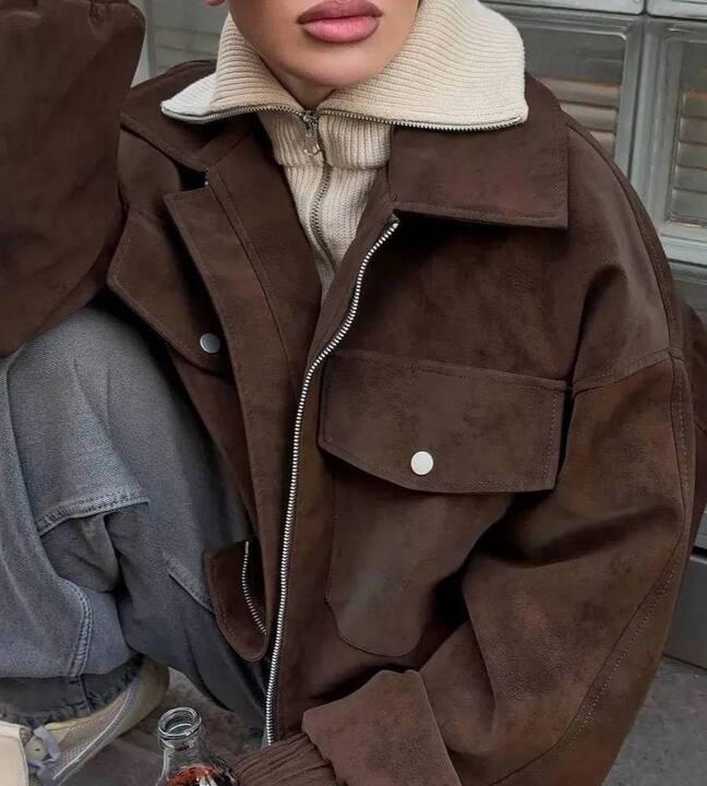 Материал под эко-замшу делает эту модель особенно выразительной. Фактура выглядит благородно, дорого и добавляет образу глубину, за счет чего бомбер смотрится более статусно и интересно. Контрастный воротник придает модели дополнительный акцент, делает ее более заметной и подчеркивает современный характер изделия. Крупные накладные карманы на передней части не только добавляют практичности, но и выступают стильной деталью, которая делает фасон еще более актуальным.