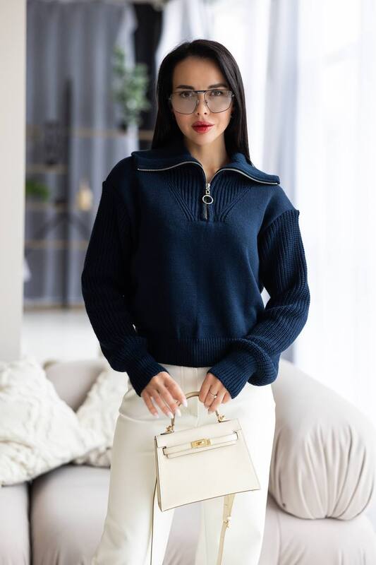 Женский свитер с воротником на молнии — это универсальная и стильная вещь, которая станет акцентом в гардеробе для прохладных осенних дней. Модель выполнена из мягкой и комфортной пряжи с добавлением шерсти (30%) и акрила (70%), что обеспечивает уют, тепло и износостойкость.