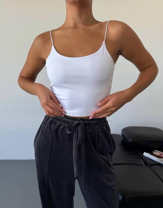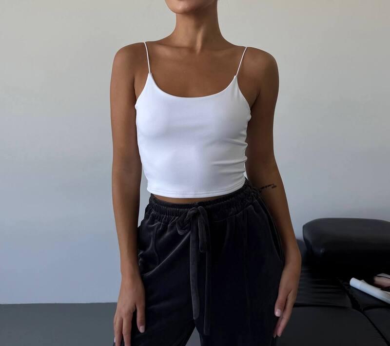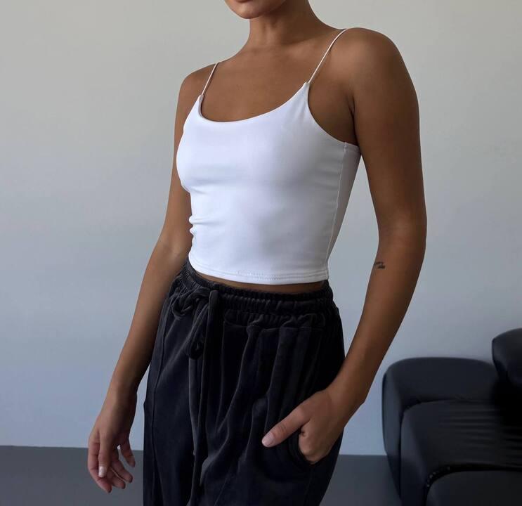 Модель имеет облегающую посадку, благодаря которой красиво подчёркивает силуэт и делает образ более аккуратным и собранным. Тонкие бретели добавляют визуальной лёгкости, открывают линию плеч и шеи, делая общий вид более изящным и женственным. Верхняя линия смотрится мягко и гармонично, поэтому топ хорошо подходит как для самостоятельной носки, так и в качестве базы под рубашку, кардиган, пиджак или другую накидку. Такой фасон особенно удобен тем, что не перегружает образ, но при этом всегда выглядит уместно и привлекательно.