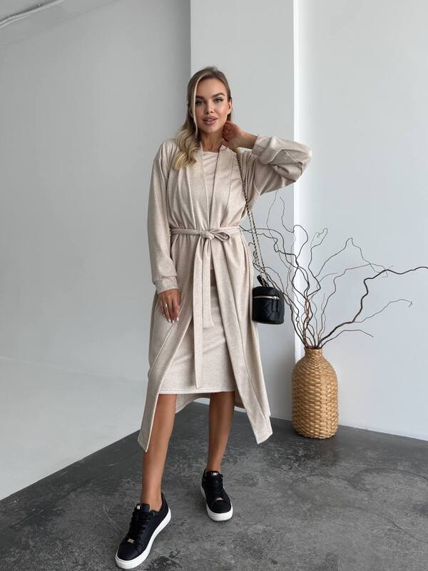 Комплект состоит из платья миди и удлиненного кардигана с поясом. Платье имеет прямой лаконичный крой, который подчеркивает силуэт и идеально подходит для любого типа фигуры. Кардиган с поясом позволяет регулировать посадку и создавать разные варианты образов: можно носить в завязанном виде, подчеркивая талию, либо в свободном стиле для более расслабленного повседневного образа.