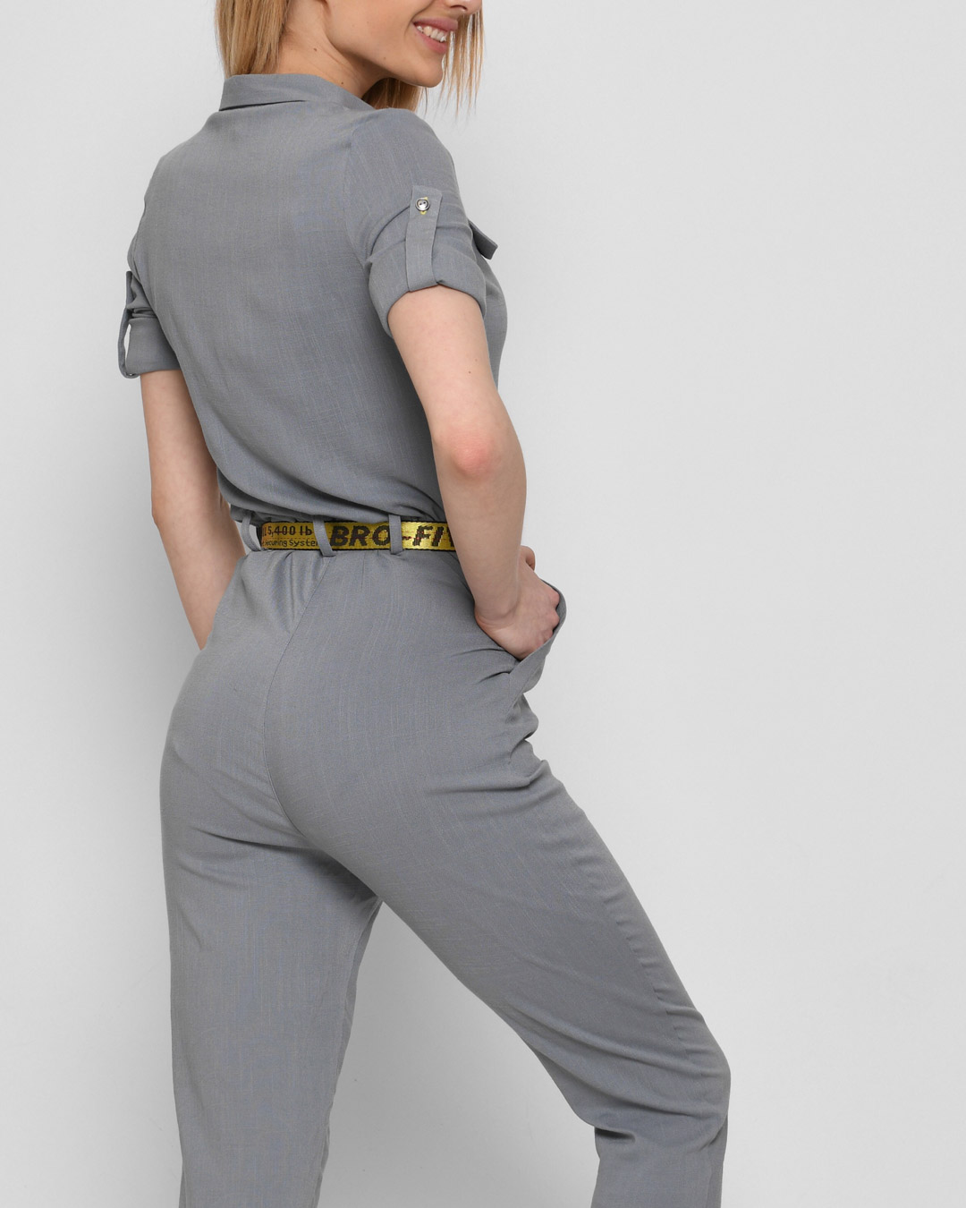 Стильный комбинезон из льна. Верх в рубашечном стиле с отложным воротником, рукав, который можно подвернуть, два кармана на груди и застежка на ряд пуговиц спереди. Низ с двумя карманами по бокам, на талии стильный контрастный пояс.