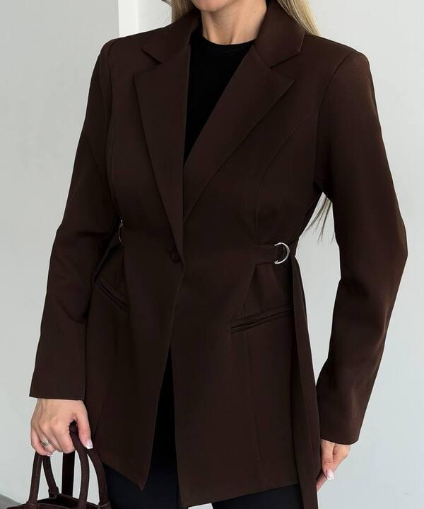 Отдельное внимание привлекает регулируемая талия. Затяжки позволяют подстроить посадку под фигуру, сделать силуэт более женственным и подчеркнуть линию талии именно так, как нужно. Благодаря этому модель выглядит не просто классической, а более выразительной и актуальной. Длинный рукав делает пиджак удобным для весеннего сезона, а средняя длина позволяет легко сочетать его с брюками, джинсами, юбками, платьями, топами и блузами. Модель визуально вытягивает силуэт и делает образ более изящным.