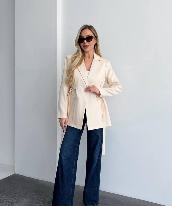 Отдельное внимание привлекает регулируемая талия. Затяжки позволяют подстроить посадку под фигуру, сделать силуэт более женственным и подчеркнуть линию талии именно так, как нужно. Благодаря этому модель выглядит не просто классической, а более выразительной и актуальной. Длинный рукав делает пиджак удобным для весеннего сезона, а средняя длина позволяет легко сочетать его с брюками, джинсами, юбками, платьями, топами и блузами. Модель визуально вытягивает силуэт и делает образ более изящным.