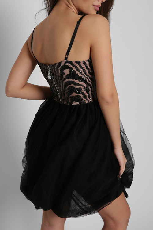 Сезон вечеринок и корпоративов открыт. Эта модель имеет облегающий верх и пышную юбку. Верх состоит из топа с россыпью паеток и тонких регулируемых бретелей. Низ из воздушной юбки с несколькими слоями сетки. Добавьте туфли на каблуке и несколько лаконичных украшений для завершения образа.