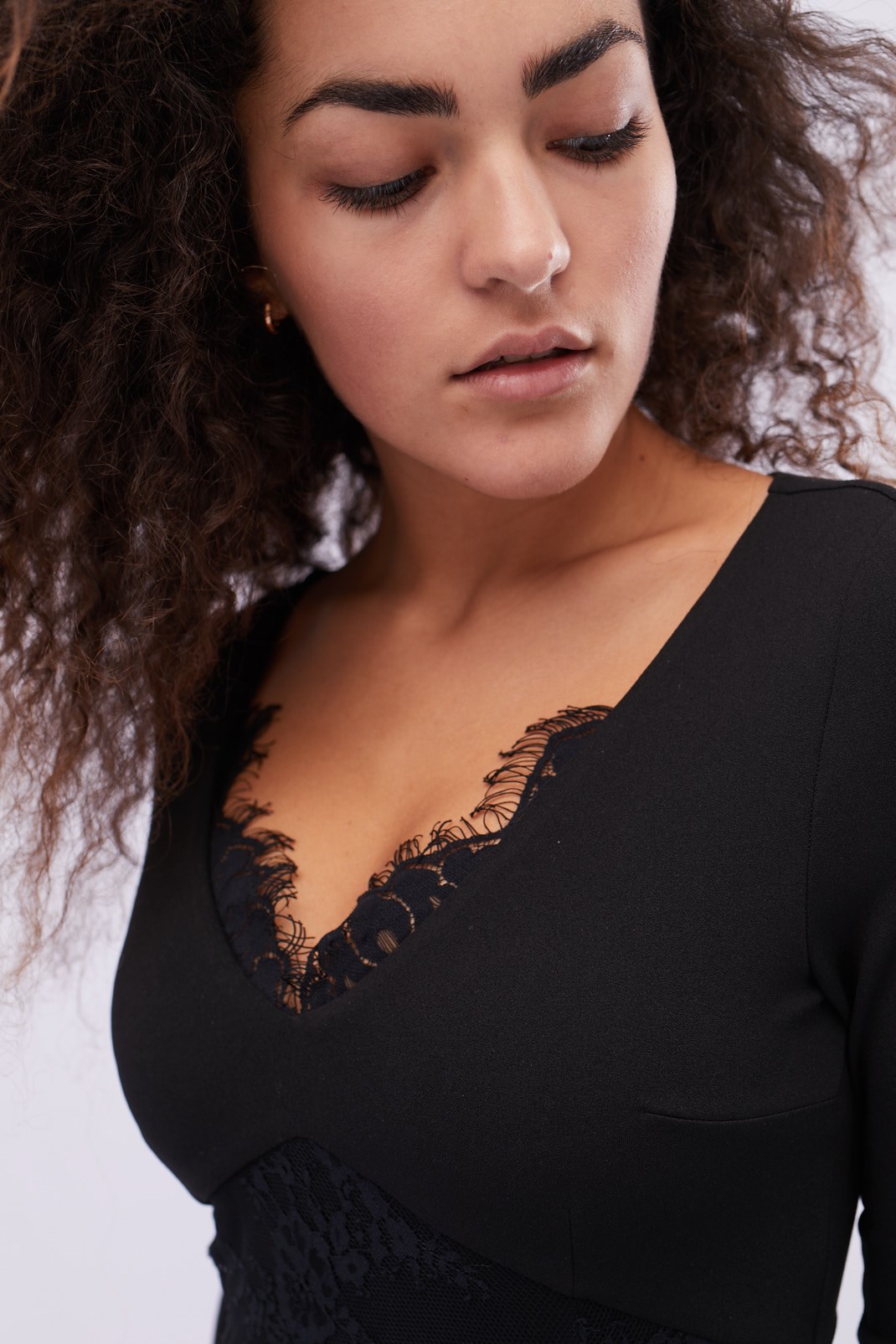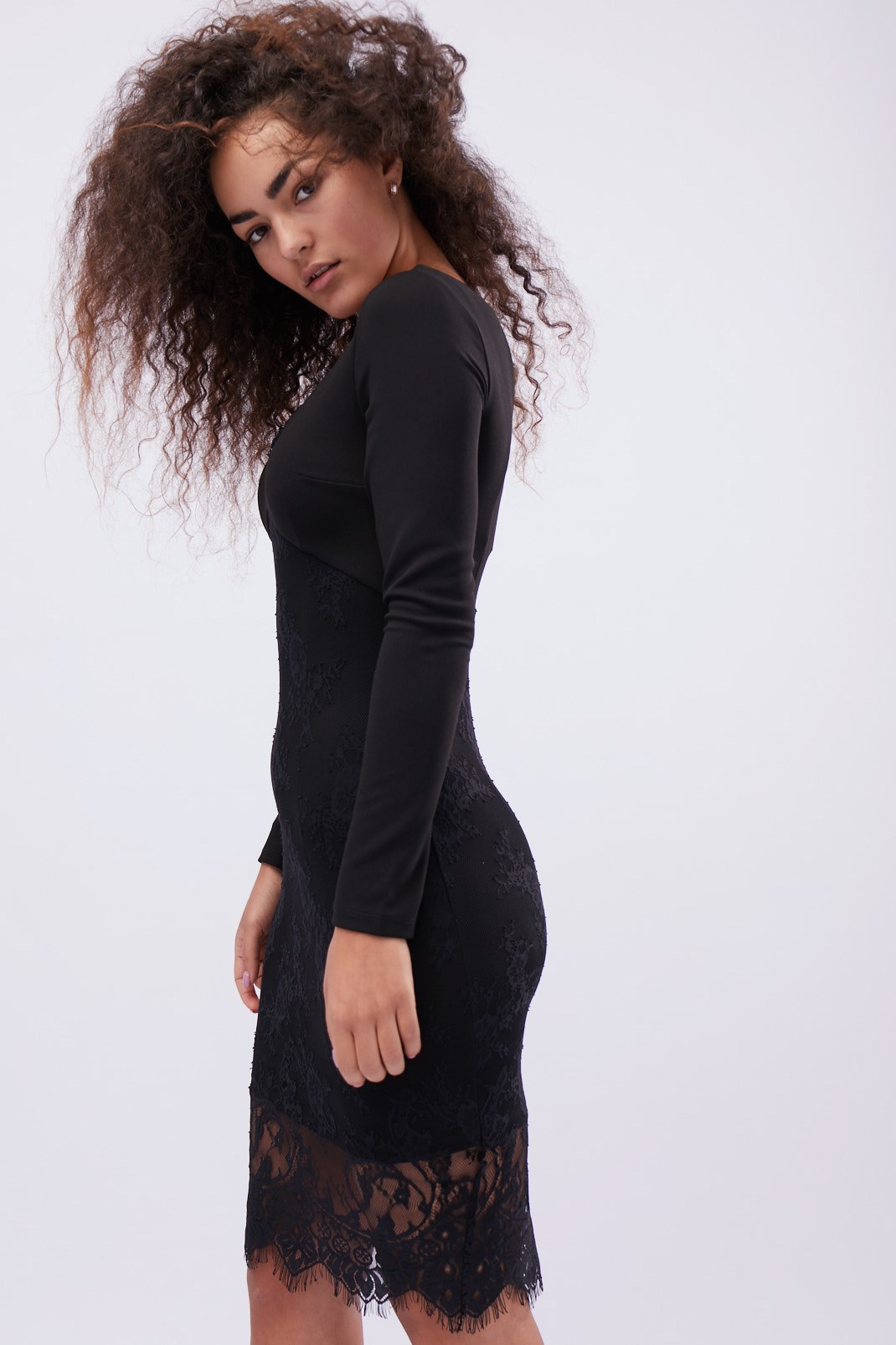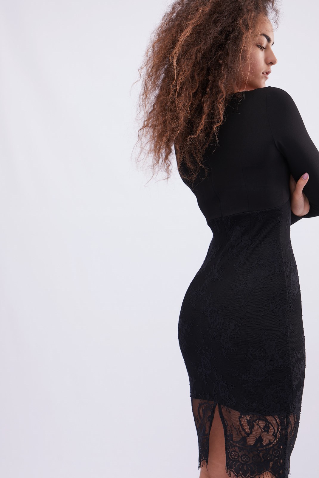 Стильное гипюровое платье из гипюра. Благодаря облегающему силуэту выгодно подчеркивает достоинства фигуры. V-образный вырез, низ платья и отрезная линия талии украшены кружевом. Добавьте маленькую сумочку и обувь на высоком каблуке и женственный образ готов.