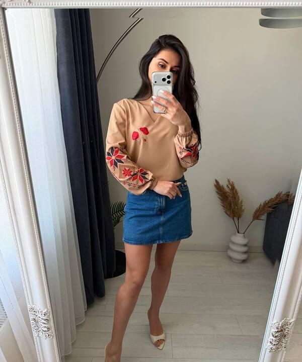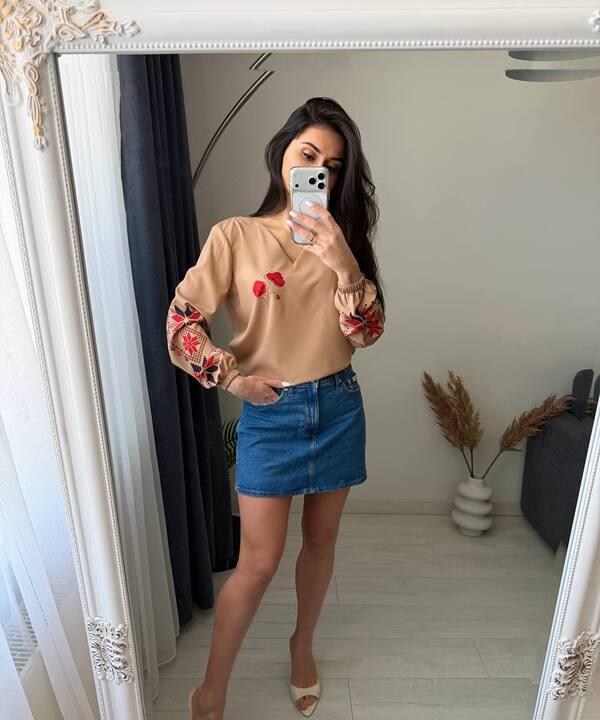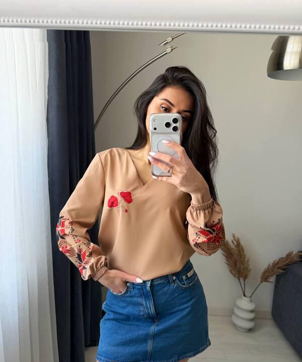 Особую выразительность этой модели придает декоративное оформление. Контрастный узор на рукавах делает блузу заметной и добавляет образу характер, а вышитый акцент на передней части смотрится стильно, женственно и аккуратно. За счет таких деталей изделие выглядит не просто базовой вещью, а полноценным элементом гардероба, который помогает сделать образ более живым и интересным. Это отличный выбор для тех, кто любит удобные, легкие и красивые вещи с декоративными акцентами.