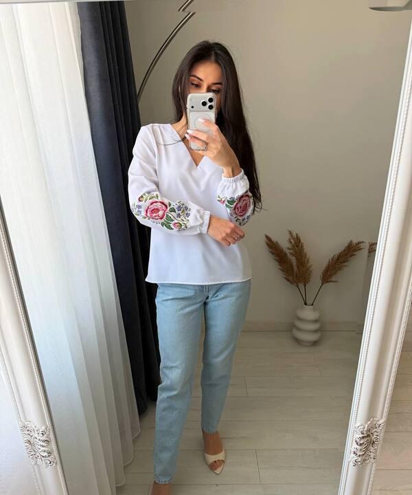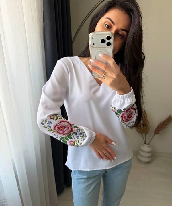 Особую выразительность модели придает декоративное оформление. Нежный цветочный рисунок на рукаве делает блузу заметной и добавляет образу мягкости, женственности и легкого романтичного настроения. За счет такой детали изделие выглядит не просто базовой вещью, а полноценным элементом гардероба, который помогает сделать образ более живым, аккуратным и привлекательным. Такая блуза станет отличным выбором для тех, кто любит сочетание комфорта, легкости и красивых деталей в повседневной одежде.