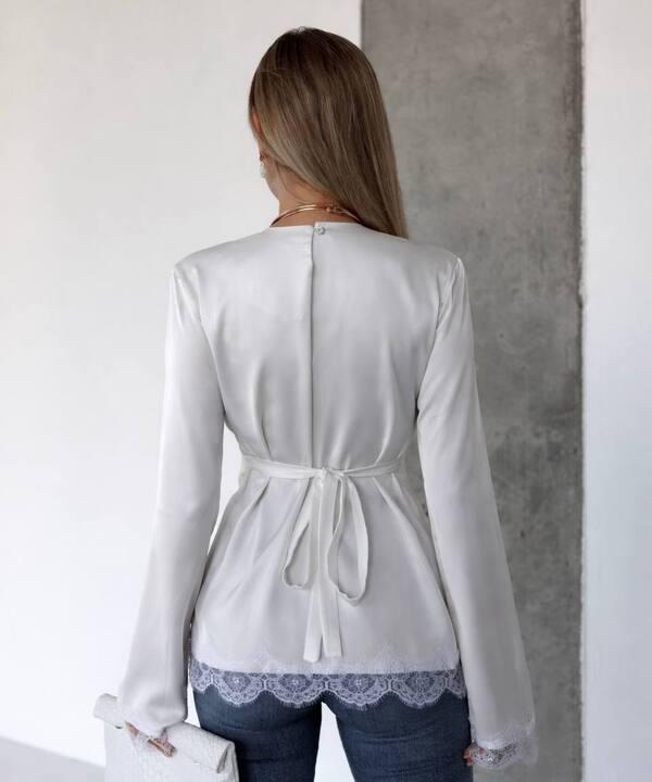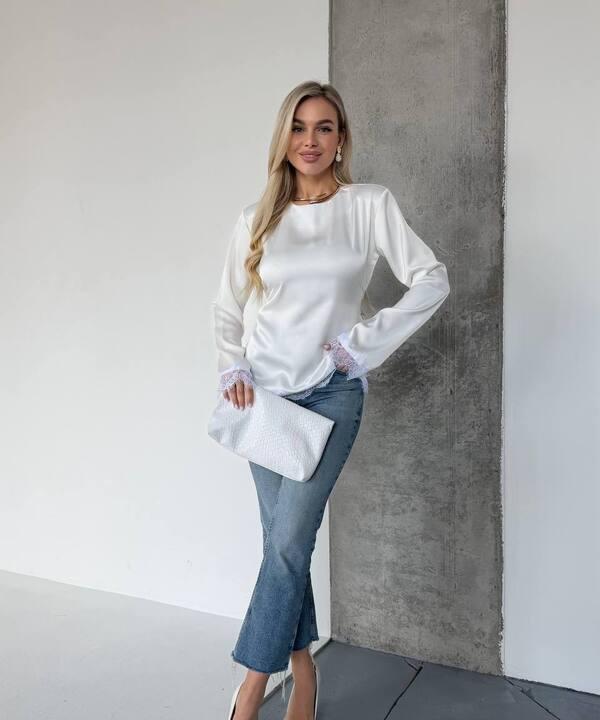Фасон модели лаконичный и универсальный, поэтому блуза легко сочетается с разными вариантами низа. Длинные рукава делают ее практичной для более прохладной погоды, а аккуратный круглый вырез подчеркивает сдержанную элегантность модели. Особую привлекательность изделию придает кружевной декор по нижнему краю и на манжетах. Именно эти детали делают блузу более нежной, изысканной и запоминающейся, добавляя образу легкую романтичность и выразительность.