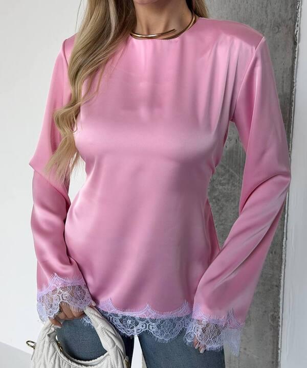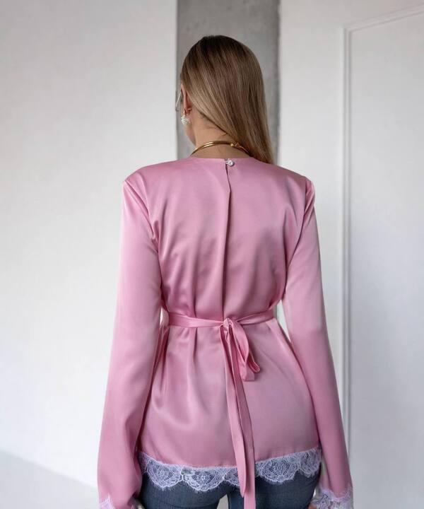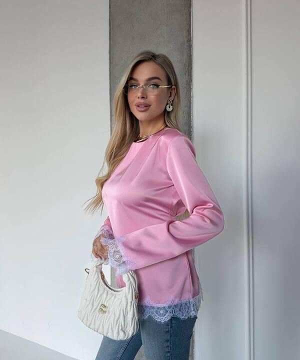 Фасон модели лаконичный и универсальный, поэтому блуза легко сочетается с разными вариантами низа. Длинные рукава делают ее практичной для более прохладной погоды, а аккуратный круглый вырез подчеркивает сдержанную элегантность модели. Особую привлекательность изделию придает кружевной декор по нижнему краю и на манжетах. Именно эти детали делают блузу более нежной, изысканной и запоминающейся, добавляя образу легкую романтичность и выразительность.