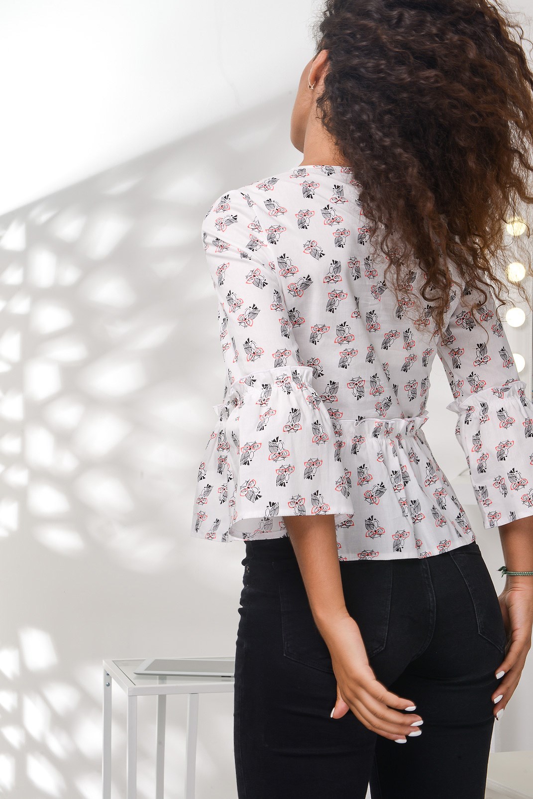 Доступные размеры :[S] Размер S:Рост модели:169 смДлина изделия:55Длина плеча:11Длина рукава:46Обхват груди:94Ширина плечей:37Женская блузка из хлопка. Прямой силуэт с баской. Рукава украшены рюшами в один цвет с блузкой. Застежка на капельку со спин.. Читать полностью