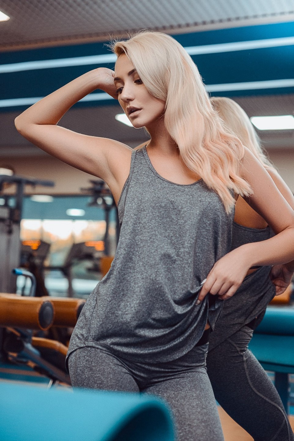 Модная спортивная майка. Силуэт оверсайз на широких бретельках. На спине резинка с надписью. Отличный выбор для фитнеса, занятий спортом или танцев.