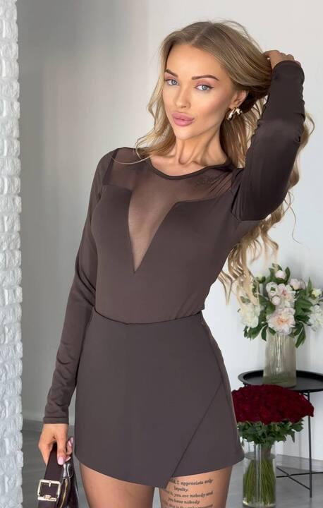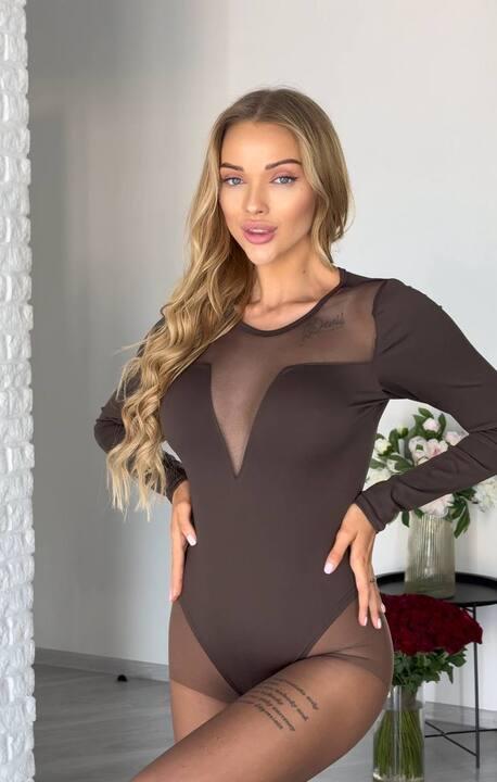 Облегающий силуэт красиво подчеркивает фигуру, делает линии более четкими и помогает сформировать аккуратный, собранный образ. Длинные рукава добавляют модели элегантности и визуально уравновешивают более акцентный верх. Прозрачная вставка из трикотажной сетки в зоне декольте и плеч делает дизайн особенно выразительным, добавляет образу легкость, изящность и ту самую эффектность, которая сразу выделяет изделие среди базовых моделей. За счет такого решения боди выглядит не просто красиво, а действительно стильно и дорого.