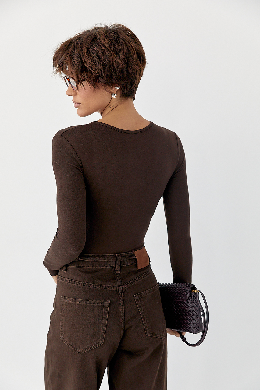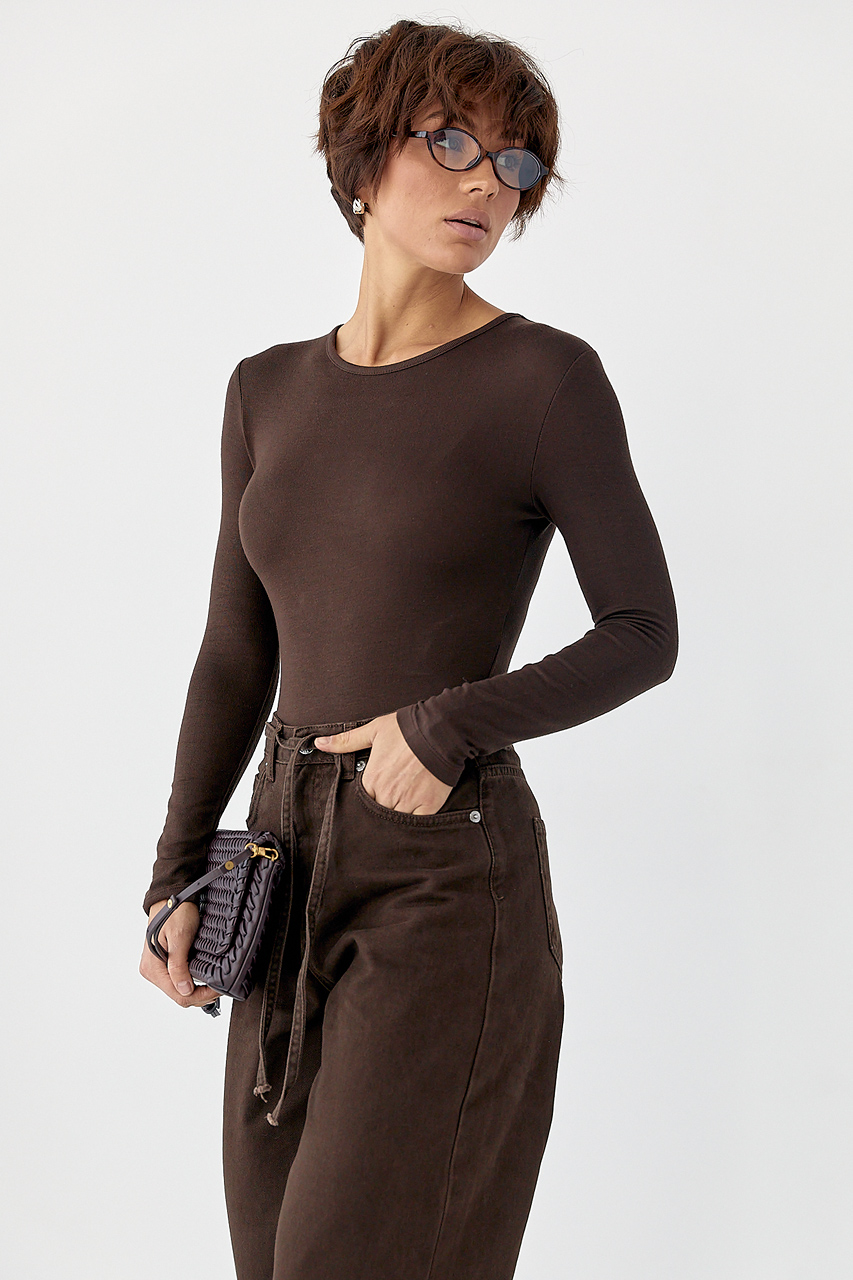 Трикотажне боді з довгими рукавами — однотонна базова модель з еластичної тканини, що добре тягнеться та комфортно облягає фігуру.