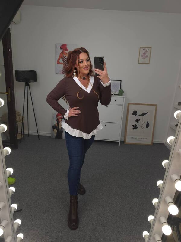 Главная особенность модели — эффект “обманки”. Белые вставки по краю подола, манжетам и вырезу создают визуальное впечатление, будто под кофту надета сорочка. Такой прием делает образ многослойным и стильным, не утяжеляя его. V-образный вырез подчеркивает шию и визуально стройнит верхнюю часть фигуры, а аккуратные воланчики по низу додають жіночності та ніжності.