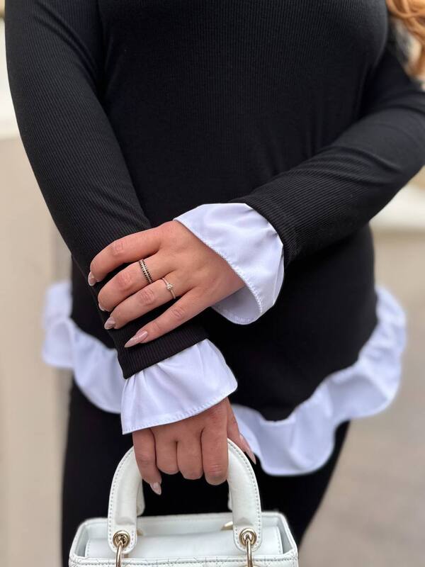 Кофта выполнена в эффекте “обманки”: визуально создается впечатление, будто вы надели рубашку под трикотажный джемпер. Контрастные вставки на манжетах и подоле, а также V-образный вырез с белым коміром додають образу витонченості й елегантності. Такий дизайн дозволяє легко створювати стильні повсякденні або офісні луки без зайвих зусиль.