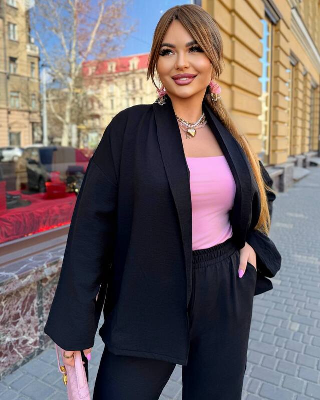 Верх выполнен в формате удлинённого жакета на запах с глубоким V-образным вырезом, который красиво открывает зону декольте и делает образ более изящным. Пояс позволяет подчеркнуть талию и отрегулировать посадку так, как удобно именно вам. За счёт этого костюм красиво садится на разные типы фигуры, создавая аккуратный и привлекательный силуэт. Длинные свободные рукава придают модели лёгкость и подчёркивают её современный характер. Брюки широкого прямого кроя смотрятся актуально, помогают визуально удлинить ноги и делают комплект особенно комфортным для повседневной носки.