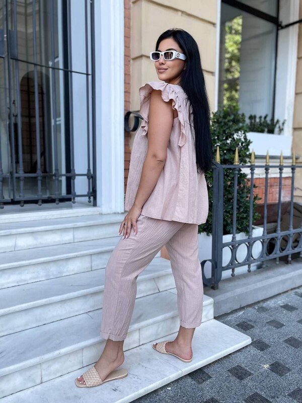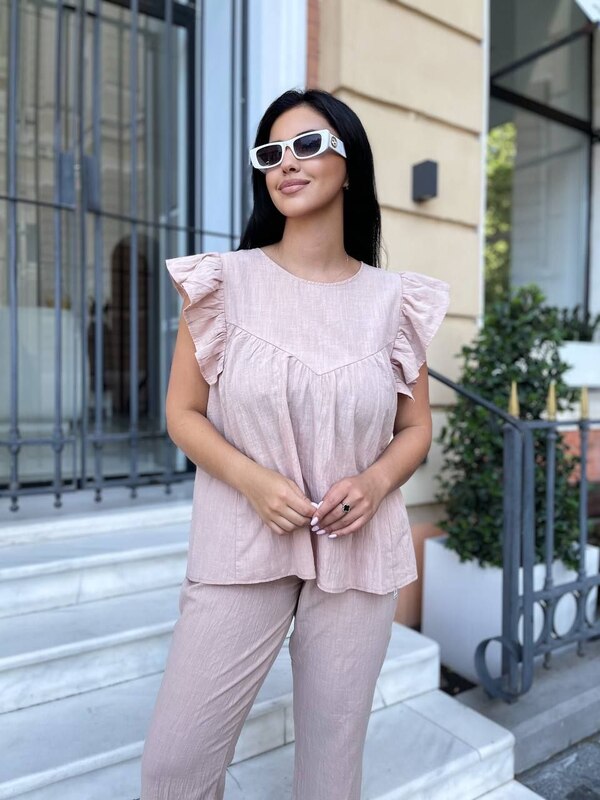 Женский костюм-двойка из жатого льна — легкий, стильный и комфортный комплект для весенне-летнего сезона. Модель состоит из блузы свободного кроя и укороченных брюк, поэтому образ выглядит нежно, аккуратно и очень удобно для повседневной носки, прогулок, отдыха, поездок и теплых дней.