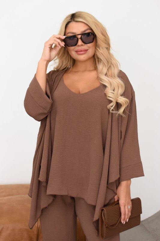 Отзывы о Костюм-тройка женский из крепа с майкой брюками палаццо и накидкой летний больших размеров k-129569