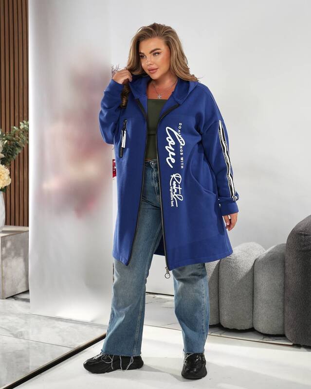 Модель имеет удлинённый крой со спинкой длиной около 100–103 см, что делает кардиган универсальным выбором для женщин, предпочитающих комфорт и функциональность. Свободная посадка обеспечивает удобство движений и позволяет легко сочетать кардиган с различными элементами гардероба, включая джинсы, брюки или платья. Наличие капюшона добавляет практичности, защищая от ветра и создавая более спортивный, современный образ.