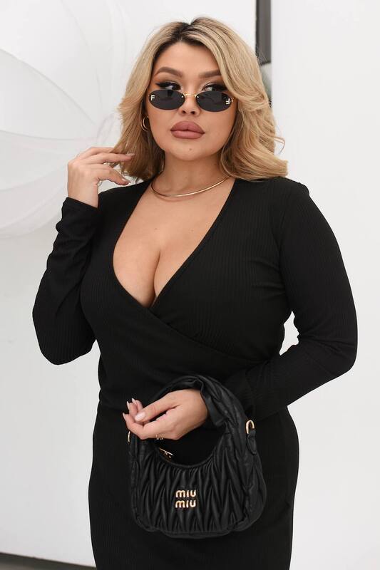 Главным акцентом платья является глубокое, но выдержанное V-образное декольте, которое придает образу изысканность и подчеркивает линии фигуры. Длинные рукава делают платье особенно практичным в прохладное время года, а боковой разрез добавляет легкости и свободы движений. Платье не имеет лишних деталей и декора, что позволяет ему быть универсальным и подходить для различных комбинаций со стилем.