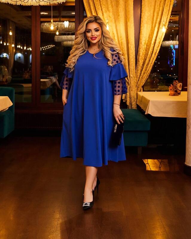 Фасон трапеция мягко ниспадает от линии груди, создавая струящийся свободный силуэт, который визуально вытягивает фигуру и скрывает возможные несовершенства. Длина миди делает платье универсальным — его можно надеть как на праздничное событие, так и на деловой ужин. Круглый вырез подчёркивает линию шеи, а свободный крой дарит комфорт и лёгкость движений.