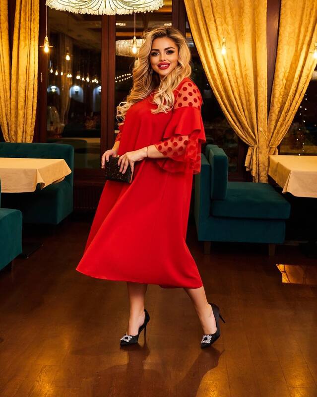 Главный акцент этой модели — роскошные рукава из флокированной сетки с крупным горохом. Полупрозрачные вставки создают изысканный контраст с плотной основой, добавляя образу романтичности и праздничного настроения. Многослойные воланы на рукавах придают платью дополнительный объём и динамичность, превращая его в эффектное решение для торжественных мероприятий. Длина рукава ¾ делает модель ещё более удобной и утончённой.