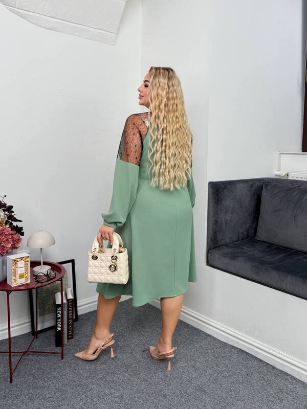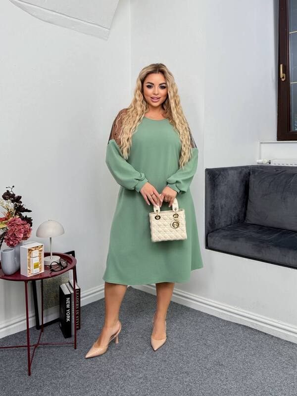 Свободный силуэт трапеция мягко струится вниз, скрывая лишние объёмы в области живота и бёдер, создавая женственный и утончённый образ. Длина миди делает модель универсальной — она одинаково хорошо смотрится с каблуками, ботильонами или стильными сапогами. Платье не сковывает движений и подходит для женщин любого типа фигуры, включая plus size, сохраняя при этом изысканный внешний вид.