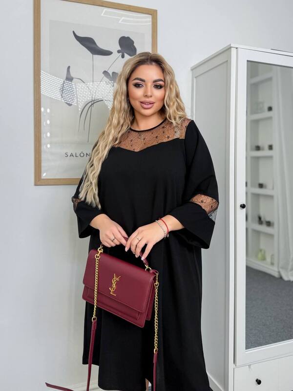 Декоративные вставки из сетки на груди и рукавах добавляют платью лёгкости и оригинальности. Они создают утончённый контраст с плотной тканью, подчеркивая элегантность и придавая образу изысканность. Рукава прямого кроя с декоративными вставками визуально вытягивают руки и придают модели завершённость. Каждая деталь продумана так, чтобы подчеркнуть женственность и комфорт одновременно.
