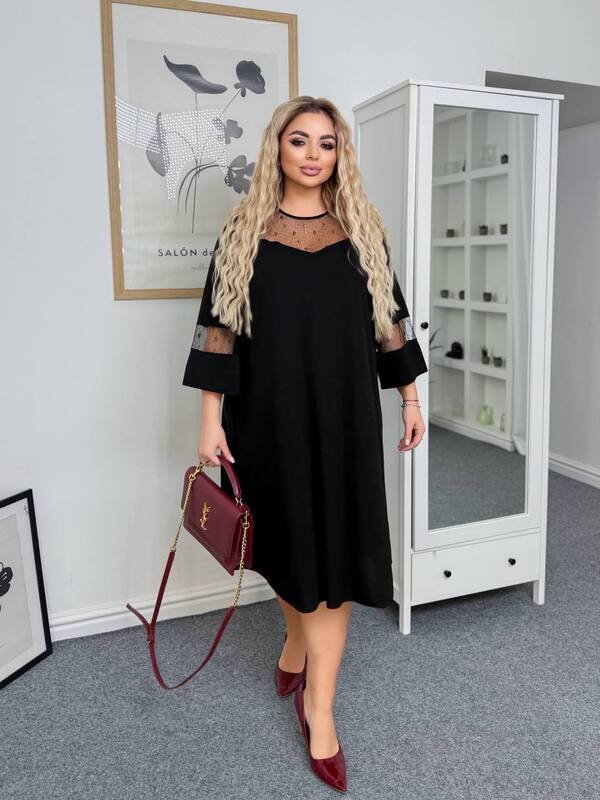 Фасон трапеция — один из самых женственных и практичных. Он визуально вытягивает силуэт, скрывает зоны живота и бёдер, создавая изящную форму. Платье подходит женщинам любого телосложения, особенно красиво смотрится на фигуре plus size. Длина миди придаёт модели универсальность: в ней удобно и на работе, и на встречах, и на вечерних мероприятиях. Классический круглый вырез делает образ лаконичным и стильным.