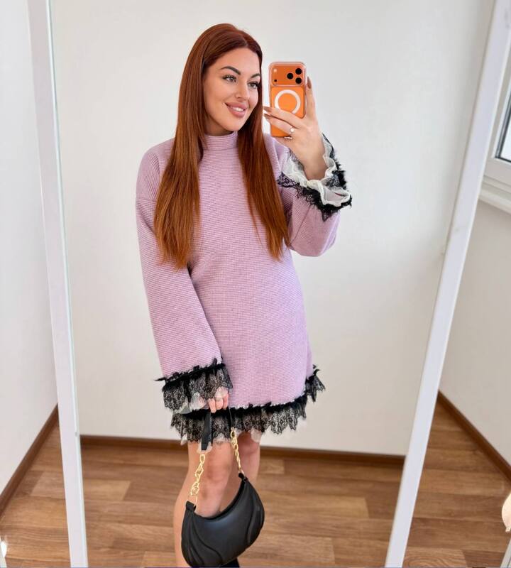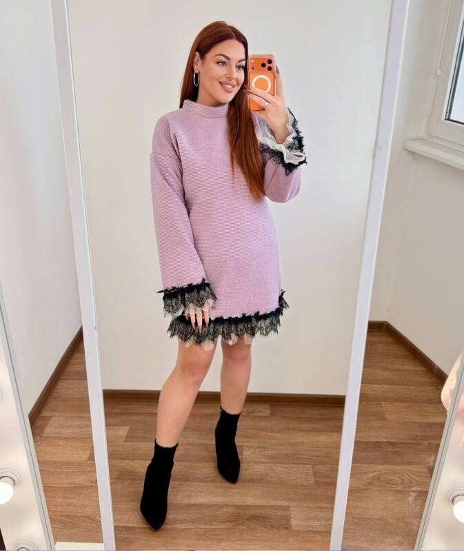 Розовый оттенок придаёт образу мягкость и утончённость, а контрастное кружево подчеркивает его оригинальность. Такое платье станет вашей любимой вещью в осенне-зимнем гардеробе — стильной, тёплой и невероятно комфортной.