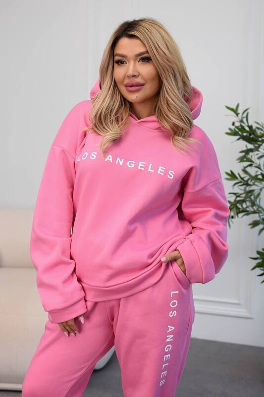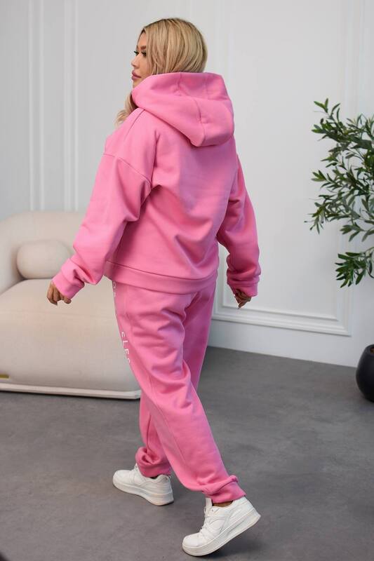 Костюм состоит из худи свободного кроя и брюк-джоггеров. Худи имеет капюшон, спущенную линию плеча и стильный принт на груди, который добавляет современный акцент в образ. Брюки на резинке с манжетами по низу обеспечивают удобную посадку и свободу движений. Мягкая трикотажная ткань гарантирует комфорт при повседневной носке, а боковые карманы делают костюм ещё более функциональным.