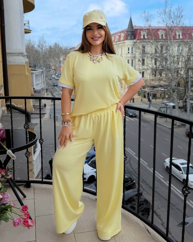 Особую выразительность комплекту придают аккуратные контрастные вставки по линии горловины, рукавов и нижнего края верха. Благодаря этим деталям костюм выглядит более продуманным, интересным и завершенным. Он не кажется слишком простым, но при этом остается универсальным и легко вписывается в повседневный гардероб. Широкие брюки добавляют образу легкости и создают красивое движение при ходьбе, а удобная посадка делает комплект особенно комфортным в течение всего дня.