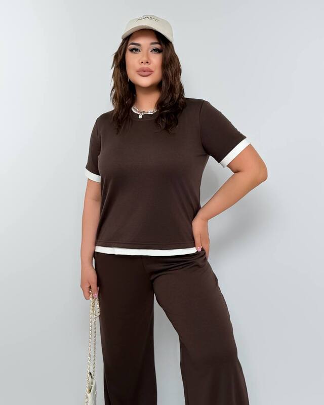 Особую выразительность модели придают аккуратные контрастные вставки по краю рукавов, горловины и нижней части верха. Эти детали делают комплект более заметным, добавляют ему свежести и создают тот самый модный акцент, который делает простую вещь более эффектной. Свободные брюки красиво струятся по силуэту, дарят комфорт в движении и делают комплект особенно удачным для прогулок, отдыха и поездок.