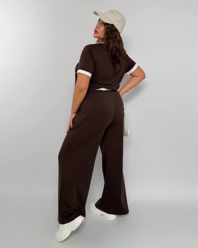 Этот женский спортивный костюм-двойка — отличный пример того, как повседневная одежда может одновременно быть удобной, современной и выглядеть действительно стильно. Комплект смотрится легко, собранно и актуально, поэтому прекрасно подходит для активного дня, прогулок, поездок и тех случаев, когда хочется чувствовать себя свободно, но при этом выглядеть аккуратно и уверенно. Верх с коротким рукавом и комфортной посадкой мягко ложится по фигуре, не сковывает движения и создает расслабленный силуэт, а широкие брюки делают образ более вытянутым, гармоничным и визуально легким.