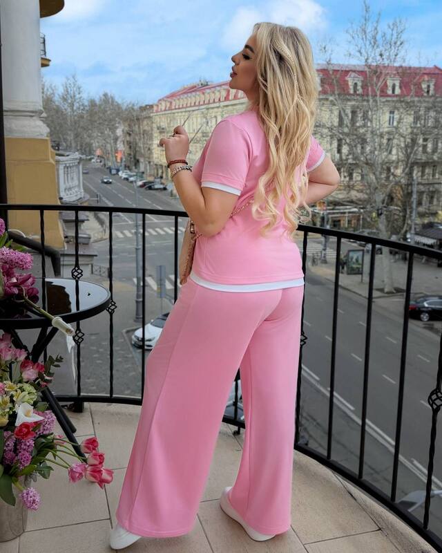 Отдельного внимания заслуживают детали модели. Аккуратные контрастные вставки по краю горловины, рукавов и низа верха делают комплект более выразительным и придают ему завершенный, продуманный вид. За счет таких акцентов образ смотрится интереснее и заметнее, но при этом остается универсальным и легко комбинируемым. Брюки свободного прямого кроя с удобной посадкой и карманами добавляют практичности, поэтому костюм подходит не только для красивого образа, но и для реальной повседневной носки.