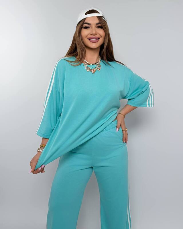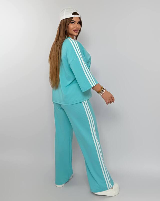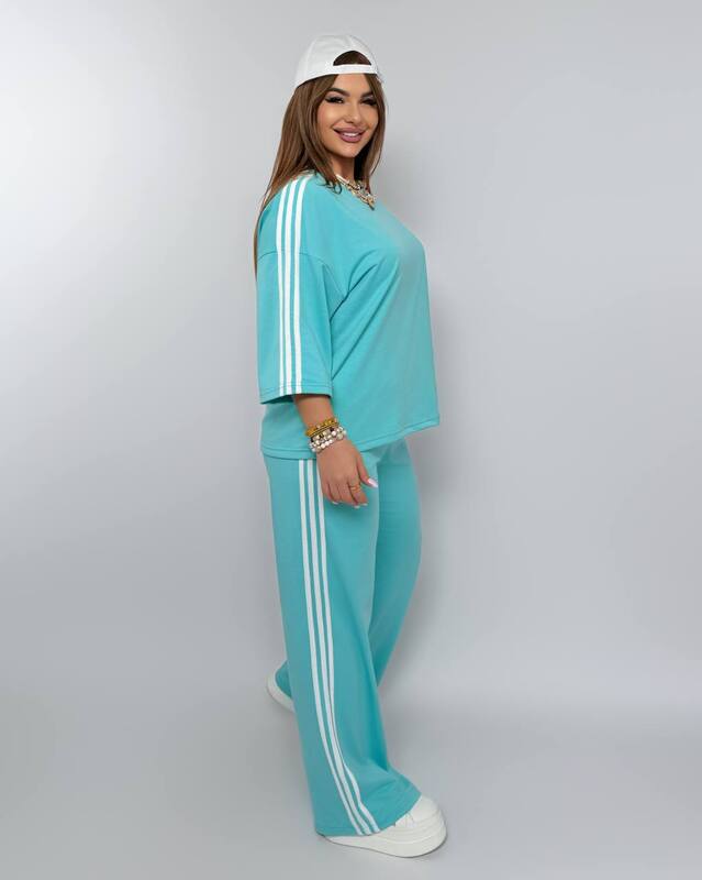 Особую привлекательность модели придают лампасы, которые проходят по верхней части и по бокам брюк. Именно эта деталь делает комплект более динамичным, модным и визуально собранным. Лампасы добавляют образу спортивный характер, но не делают его слишком простым, наоборот — костюм выглядит более продуманно и эффектно. Свободный верх и прямые широкие брюки хорошо сочетаются между собой, создавая баланс между комфортом и выразительным внешним видом.